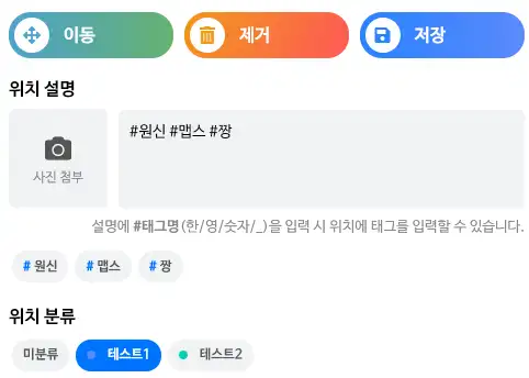 또한, 위치별 태그를 지정하여 비슷한 위치들을 사용자가 바로 검색할 수 있도록 정리할 수 있어요!