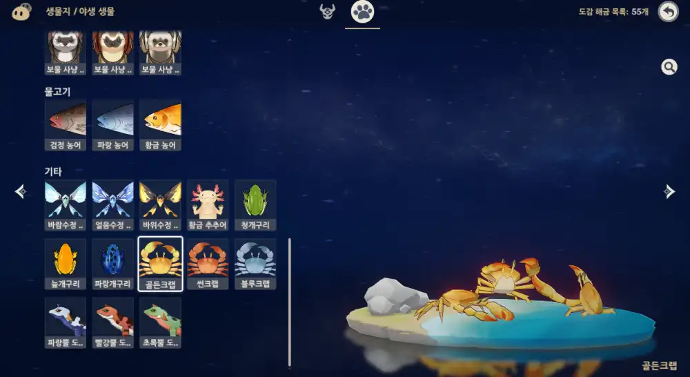 도감-생물지/야생 생물에 등록된 골든크랩과 아이템명 골든크랩이 겹칩니다.