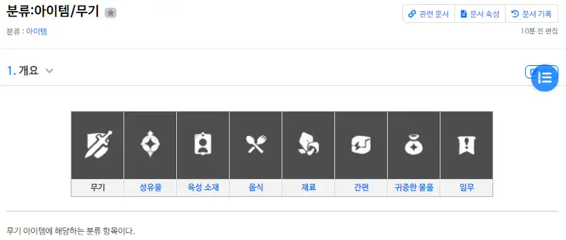 현재는 아이템 소속 문서들의 하위항목 분류 작업중에 있습니다.