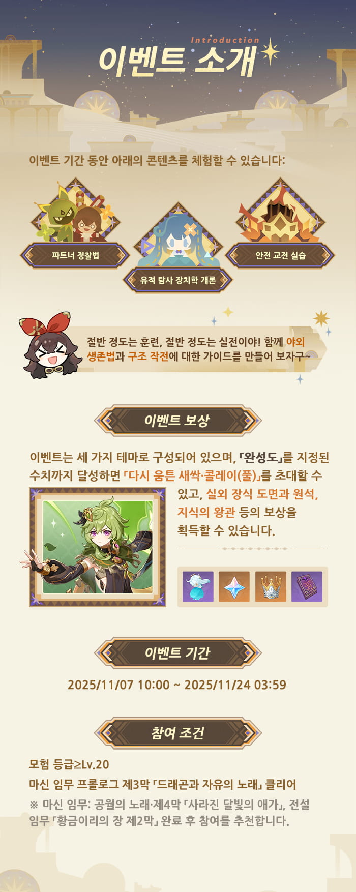 「유적 조사·생존 훈련소」 이벤트가 2025년 11월 7일 11:00(한국시간)부터 시작될 거야. 각종 도전을 완료하면 「다시 움튼 새싹·콜레이(풀)」를 초대할 수 있는 데다, 원석, 지식의 왕관, 실외 장식 도면 등 다양한 보상도 획득할 수 있어~