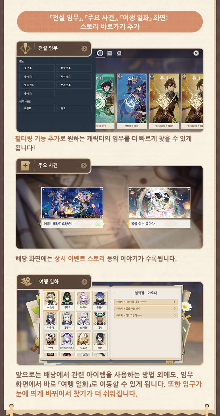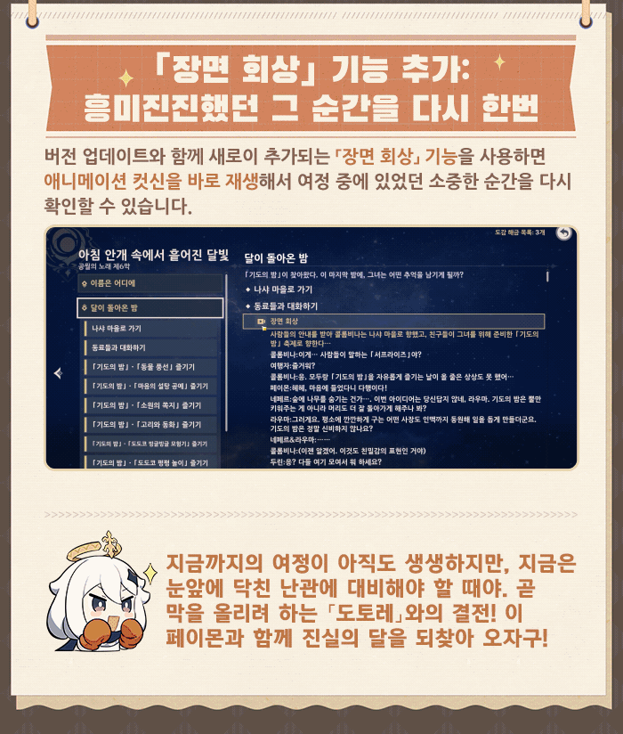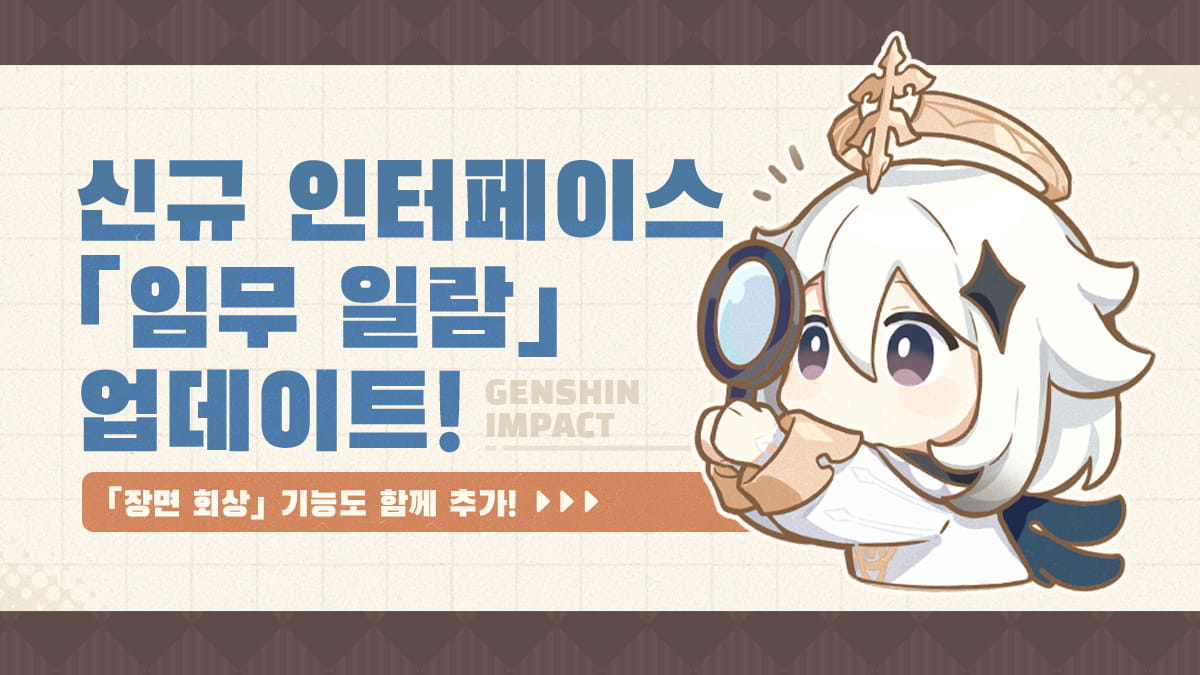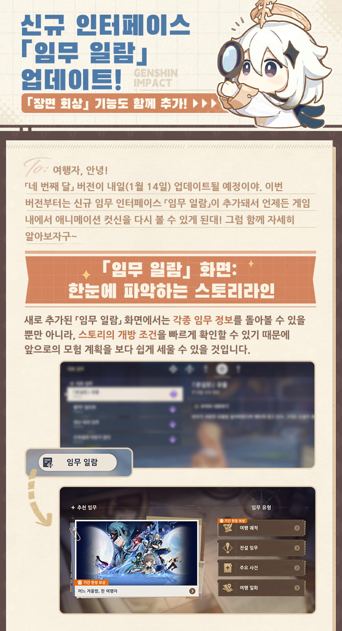 여행자, 안녕! 「네 번째 달」 버전이 내일(1월 14일) 업데이트될 예정이야. 이번 버전부터는 신규 임무 인터페이스 「임무 일람」이 추가돼서 언제든 게임 내에서 애니메이션 컷신을 다시 볼 수 있게 된대! 그럼 함께 자세히 알아보자구~