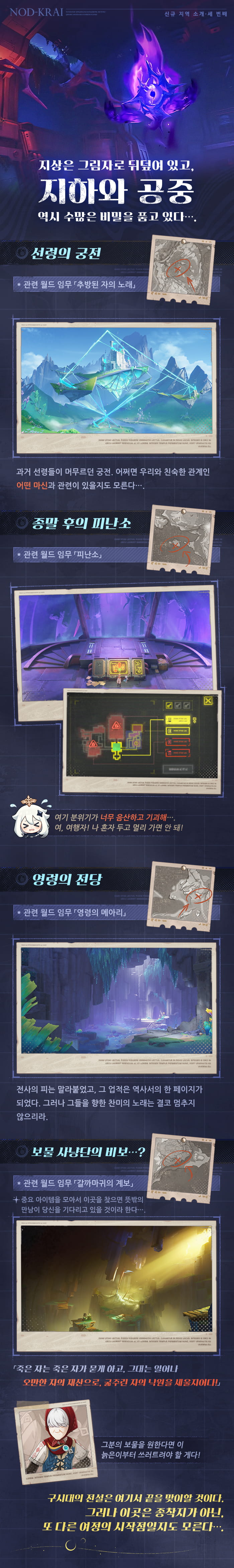 리드·밀러의 보물이 묻혀있는 곳, 선령의 궁전, 그리고 고통의 절벽이 심연에 잠식된 이유…. 이 지역의 지상과 지하, 심지어 공중에서도! 수많은 모험이 여러분의 발길을 기다리고 있답니다~