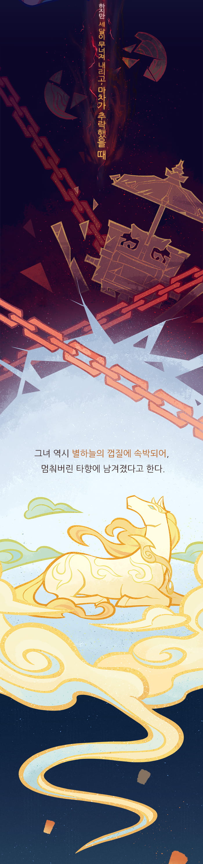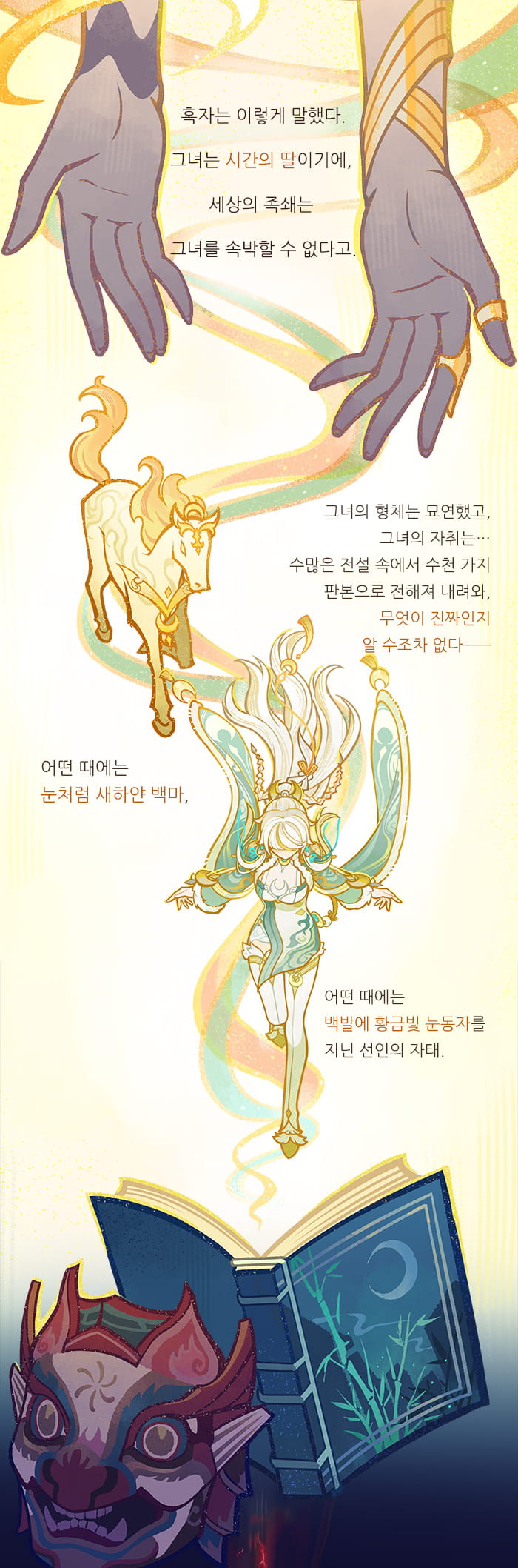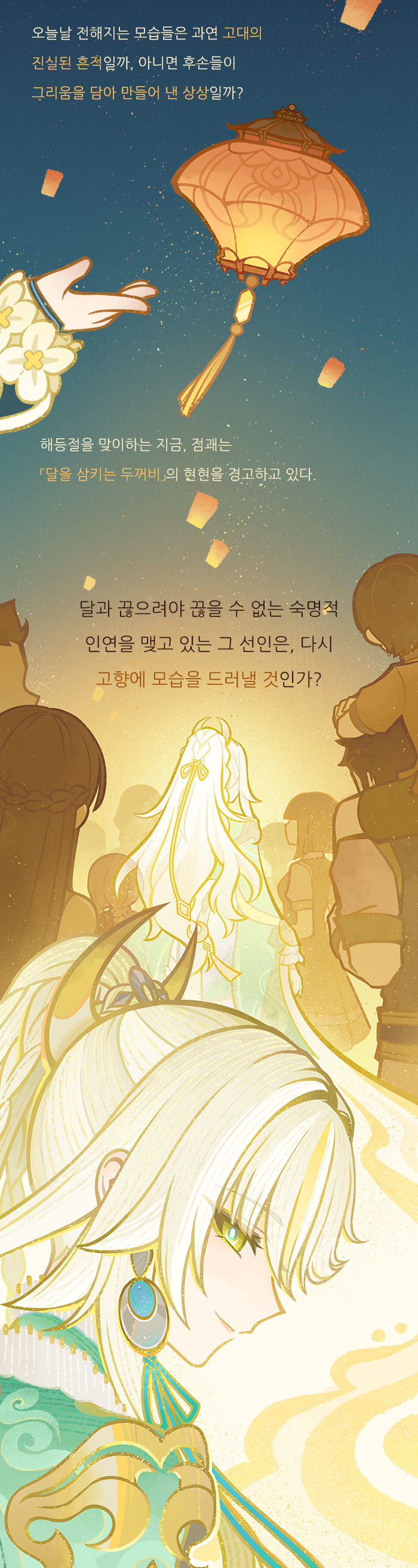 지금까지의 여정에서 스쳐 갔던, 진위를 알 수 없는 전설들——어쩌면 그것은 흐릿하게나마 여행자의 마음속에 「백마 선인」의 얼개를 그려주었을지도 모릅니다. 해등절의 등불이 다시 타오르려 하는 지금, 이야기 속에서만 존재하던 선인은 과연 고향 땅에 모습을 드러낼까요?