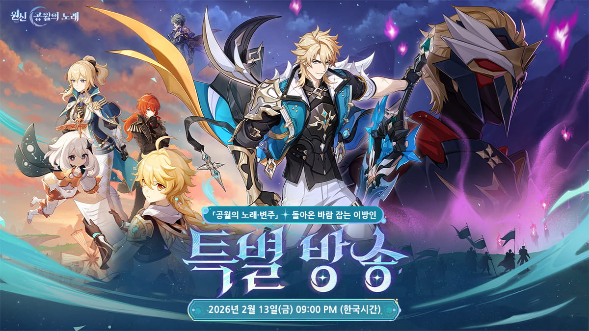 〈원신〉 신규 버전 특별 방송이 2026년 2월 13일 21:00(한국 시간)에 공식 YouTube 채널에서 진행될 예정이야!
