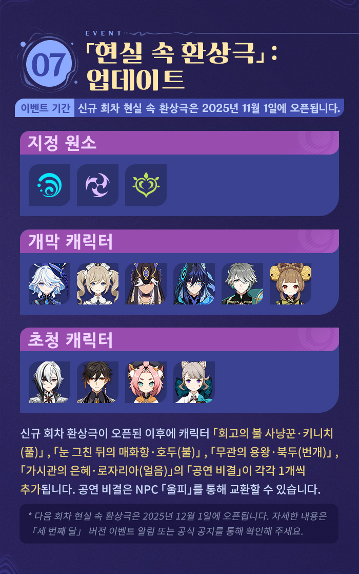 | 6202 | [소식] 〈원신〉 「세 번째 달」 버전 특별 방송 예고 | @혹사당하는페이몬21 | 2025.11.19 | 687 | 0/0 |