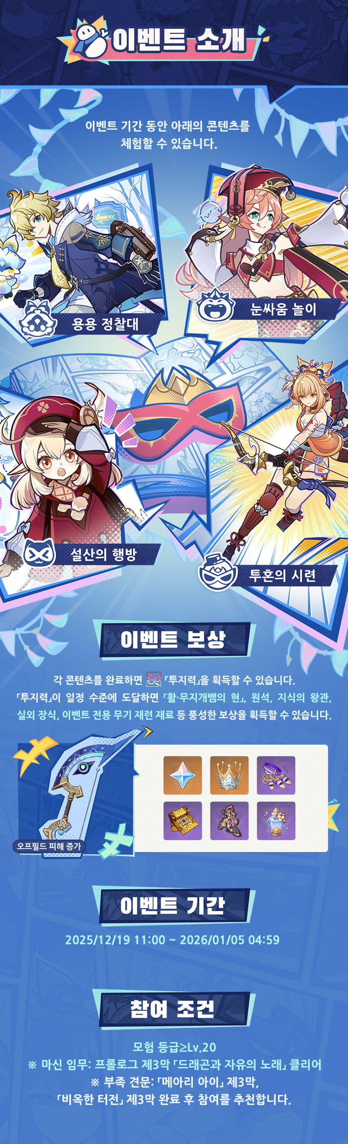 「열혈 투사의 설산 여행기」 이벤트는 2025/12/19 11:00(한국시간)부터 시작됩니다. 놀이에 참여하면 이벤트 전용 무기 「활·무지개뱀의 현」과 원석, 지식의 왕관, 실외 장식 등 풍성한 보상을 획득할 수 있어요!