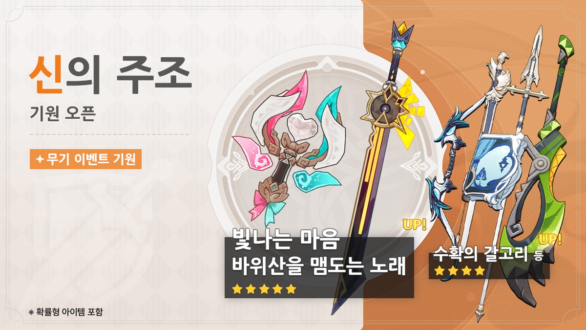 ● 이벤트 기간에 「신의 궤도」를 통해 이번 ★5 UP 무기 「법구·빛나는 마음」 또는 「한손검·바위산을 맴도는 노래」를 선택할 수 있습니다. 「신의 궤도」의 상세 규칙은 기원 화면 왼쪽 하단의 [상세]를 눌러 확인하세요.