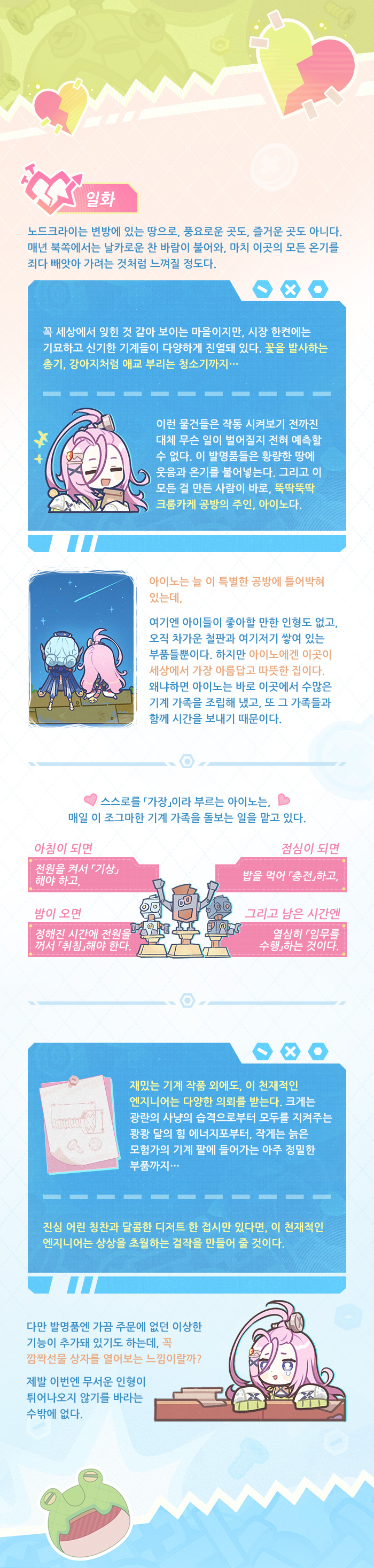 여행자, 안녕! 오늘 소개할 캐릭터는 노드크라이의 천재 기계 발명가——아이노야! 그럼 지금부터 함께 살펴 보자구~