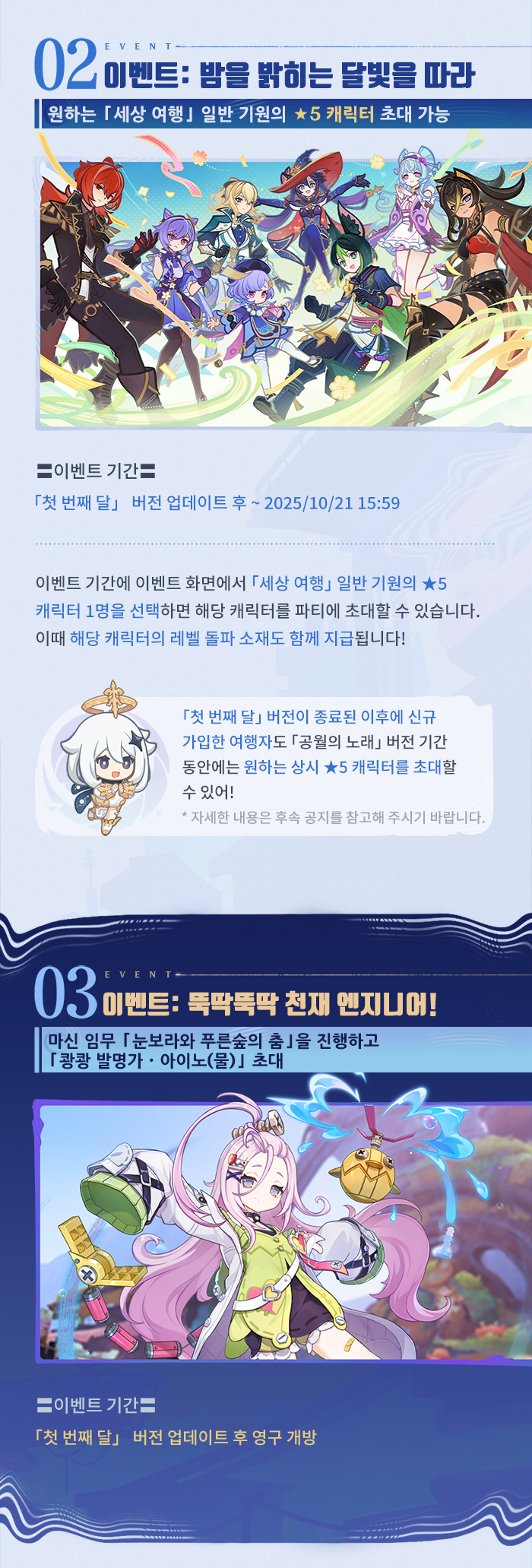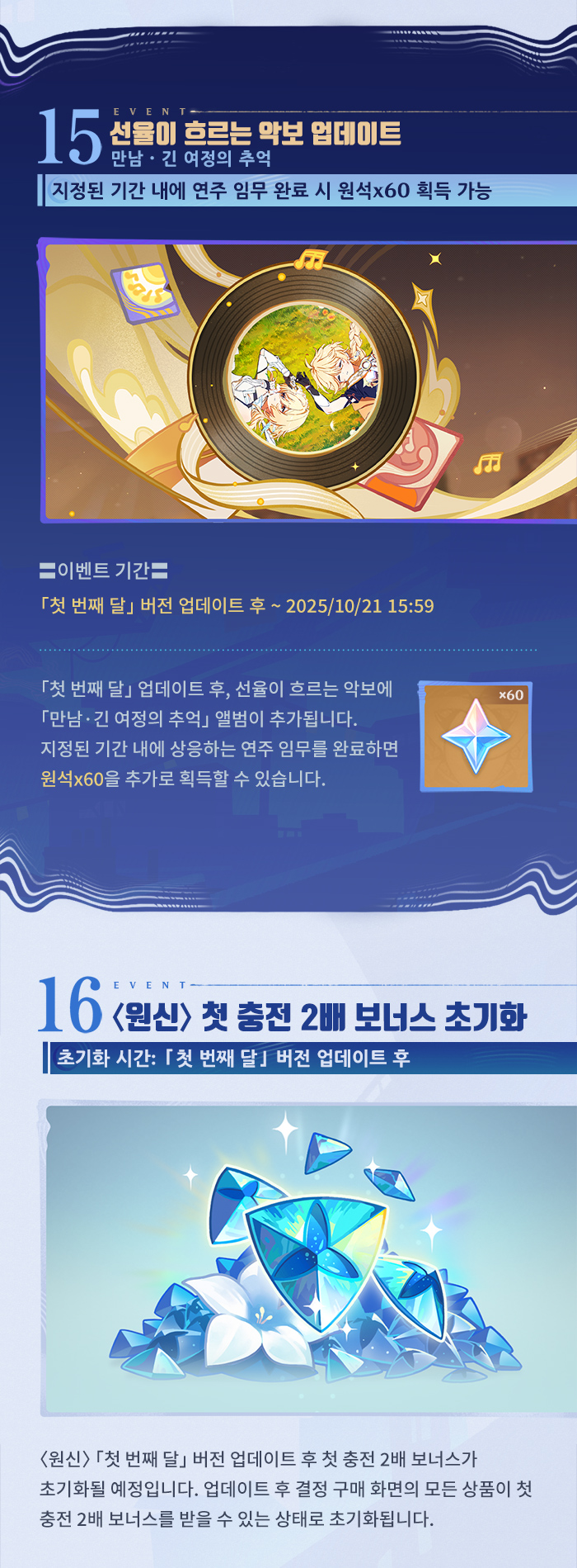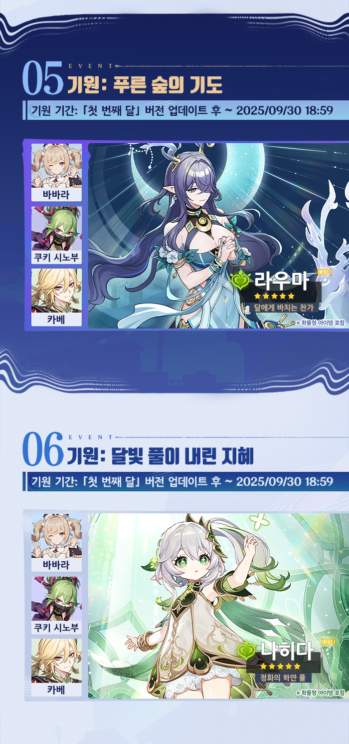 | 6156 | [소식] 「눈보라와 푸른숲의 춤」 「첫 번째 달」 버전 이벤트 알림 제2회 | @혹사당하는페이몬21 | 2025.09.25 | 240 | 0/0 |