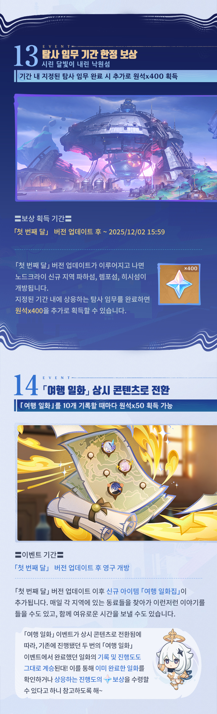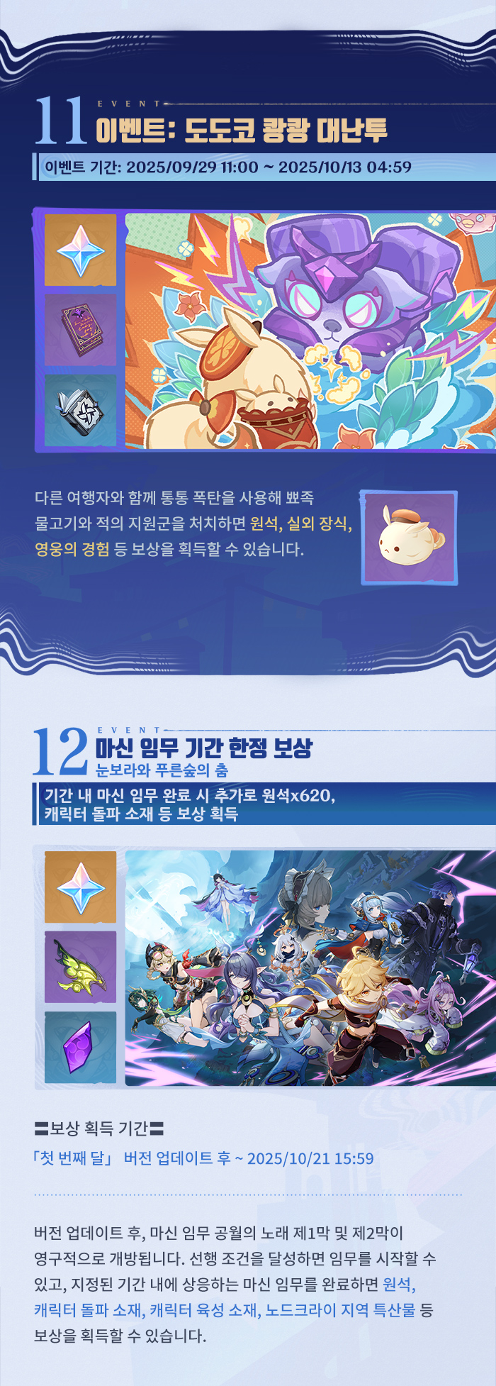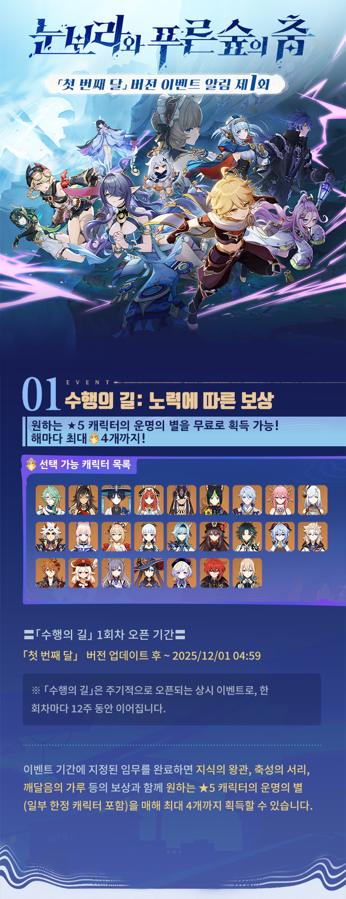 여행자, 안녕~ 「첫 번째 달」 버전 「눈보라와 푸른숲의 춤」이 곧 출시될 예정이야. 신규 버전의 혜택과 이벤트 소식을 함께 확인해 보자!