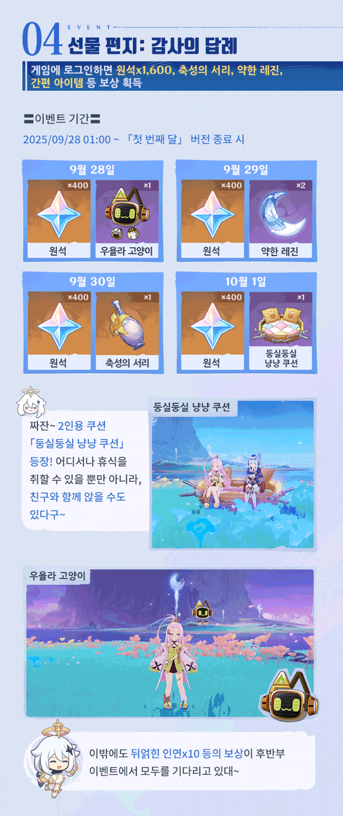 | 6160 | [소식] 원신 | 티바트 모험 기념 영상: 여행 5주년 편지 | @혹사당하는페이몬21 | 2025.09.28 | 216 | 0/0 |