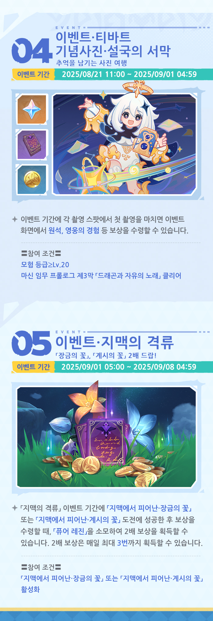 | 6126 | [소식] 「여행 일화」 상시 콘텐츠 전환 & 「전설의 길」 도전 시스템 개방! | @혹사당하는페이몬21 | 2025.09.07 | 509 | 0/0 |
