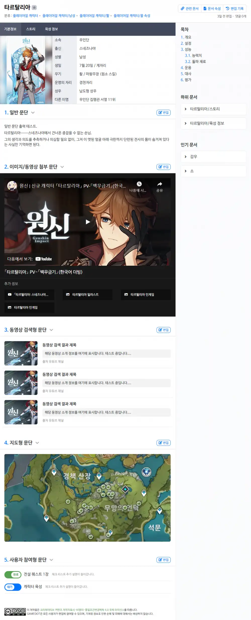 - 지도형 문단 : 원신 맵스의 지도를 첨부할 수 있습니다. 단, 문서별 1개까지만 사용이 가능하며 첨부된 지도는 여러개의 핀 정보를 담을 수 있습니다.