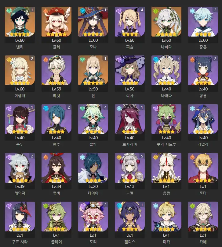 메인으로 스토리 밀고 필드 에서 노는 파티는[ 벤티 + 나히다 + 모나 + 리사 ]입니다.