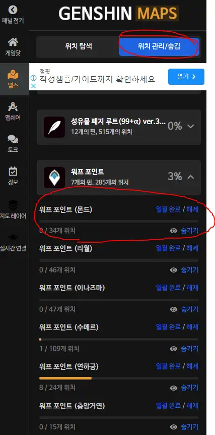 2023.05.25일 기준(3.7버전 기준) 맵스에 있는 워프포인트는 총 285개로 나와있습니다.