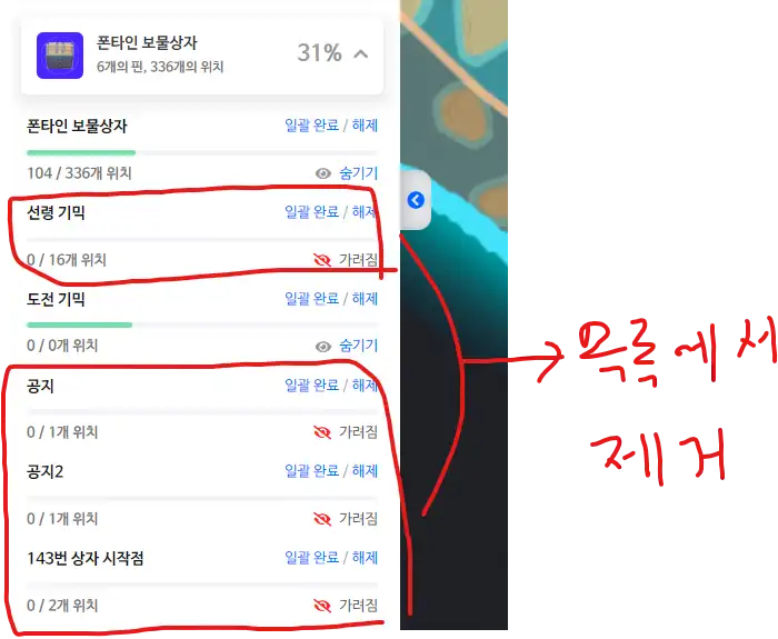 위치관리 목록에서 각 항목의 하위 정보를 목록에서 제거 가능한가요