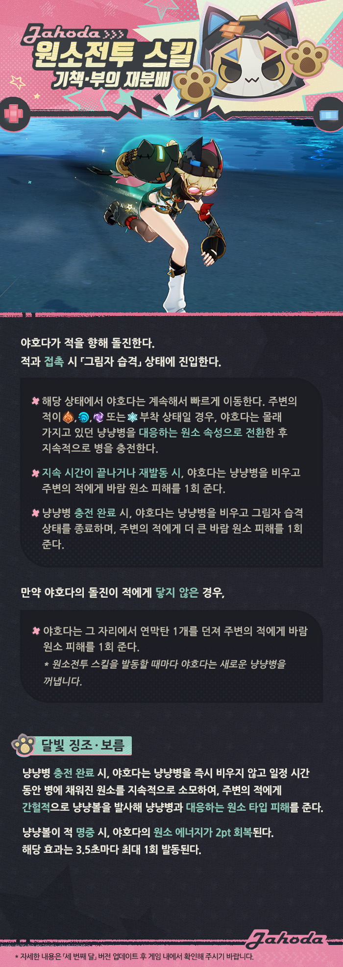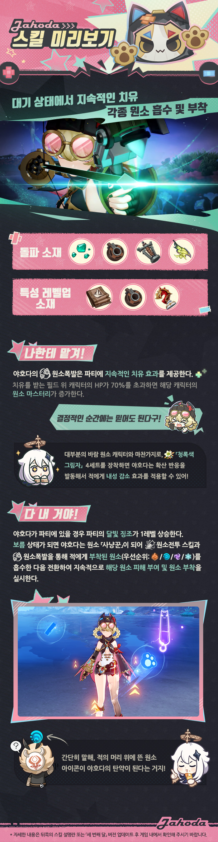 지난 마신 임무에서 야호다는 여행자, 그리고 노드크라이 사람들과 함께 수많은 모험을 겪으면서 믿음직한 동료가 되었지. 전투에서는 대기 상태에서 치유 효과를 제공하는 든든한 서포터로 활약하면서, 적에게 부착된 원소를 교묘하게 활용해 반격할 수도 있다구! 그럼 함께 자세한 내용을 살펴볼까?
