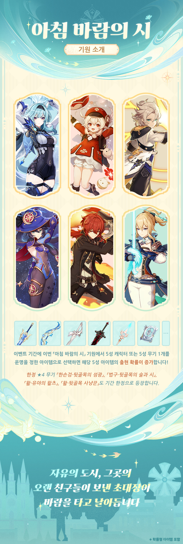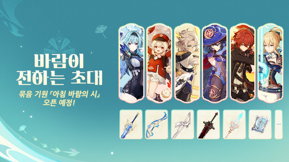 묶음 기원 「아침 바람의 시」 오픈이 머지않았습니다! 이벤트 기간에 묶음 기원을 통해 더 많은 무기와 캐릭터를 획득하여 파티를 강화하세요!