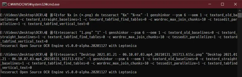 for %%x in (*.png) do "C:\Program Files\Tesseract-OCR\tesseract.exe" "%%x" "%%~nx" -l genshinkor --psm 6 --oem 1 -c textord_old_baselines=0 -c textord_straight_baselines=1 -c textord_tabfind_find_tables=0 -c wordrec_max_join_chunks=10 -c tessedit_parallelize=1 -c textord_tabfind_vertical_text=0