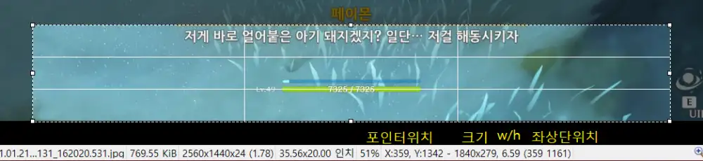 ▼자르는 작업을 일괄로 하려면 일괄 작업 목록에 적어넣을 좌표를 따야한다. 뷰어에서 영역을 선택한 후, 상태표시줄에서 좌상단 위치와 크기를 메모장에 받아적은 뒤, XnViewMP 일괄설정에 옮겨적어 .xbs (Xnview Batch Setting) 파일을 처리할 스크린샷의 해상도에 맞게 변경하자.