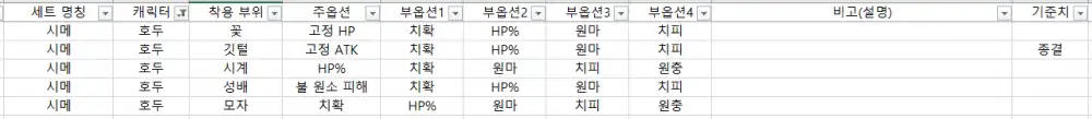 각 캐릭들의 필요한 부옵을 아래 표와 같이 최대한 맞춰야된다.