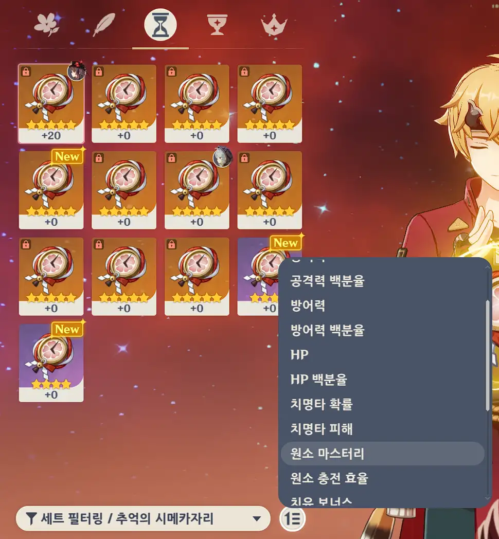 공통부분 : 거의 모든 성유물은 일단 +4, +8 이렇게 천천히 올리면서 간봐라. 귀찮다고 +20강된거 막 넣어버리는 분들 있는데 그러다 모라 없어서 모나꼴된다. (예전에 내가 그랬음. 게임 끄는데 6모라 있더라.)
