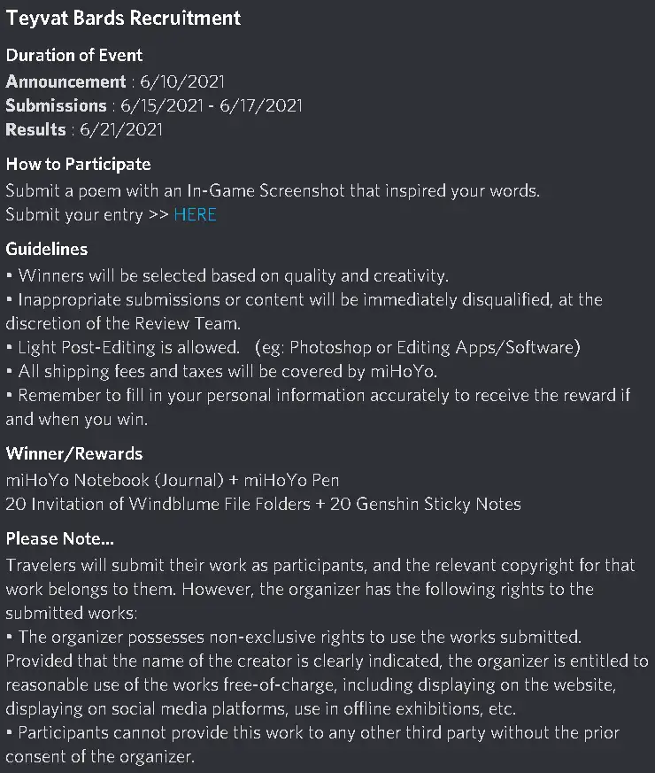 | 현재글 | 공식 디스코드 이벤트 : 티바트 음유시인 모집(Teyvat Bard Recruitment) | Jewel29 | 2021.06.11 | 4301 | 3/0 |