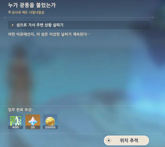 지형 변화 후 너덜너덜섬(클릭 시 맵스 워프포인트로 이동)에 가까이 가면 자동으로 받아지는 월드퀘스트.
