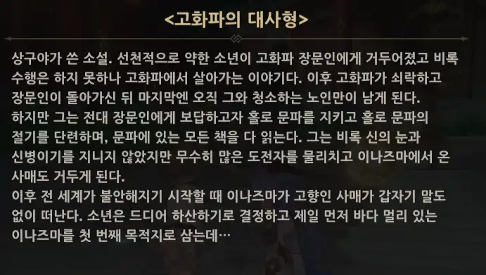 | 479 | 스토리 비경 내 상자들 : 제5장 제2막 (백석에 파묻힌 흑석) 3 | 강낭땅콩136 | 2024.08.30 | 54431 | 17/0 |
