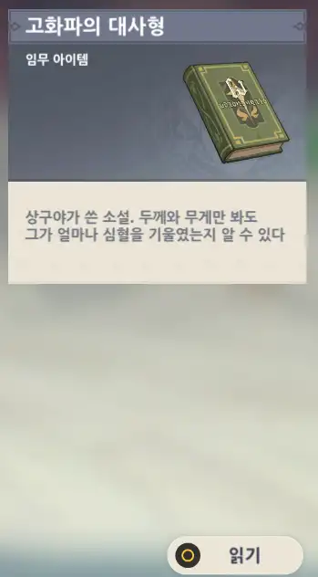소포를 뜯고 읽어서 그런지 소포는 아이템창에 사라지고 대신 책 한권을 얻을 수 있다.