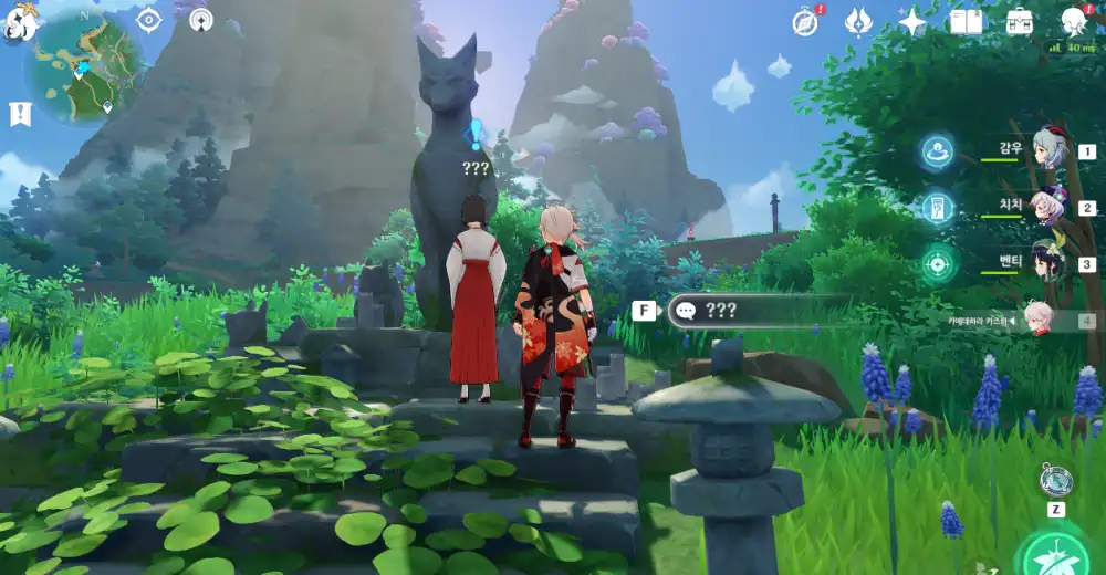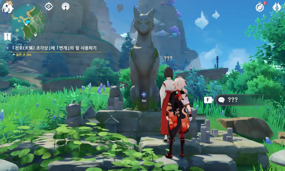 앞에 놓여진 커다란 여우 조각상에 번개 원소 공격을 하면 된다.