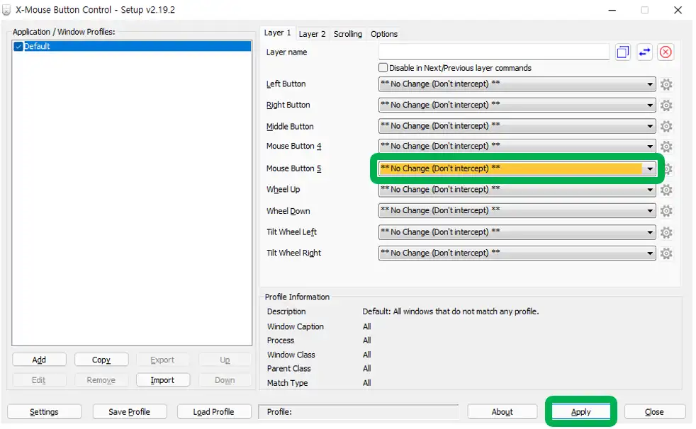 마우스에서 안 쓰는 버튼을 눌러주면 노랗게 표시됩니다. 해당 칸에 'Double Click'을 선택하고 아래의 Apply를 누르면 적용됩니다.