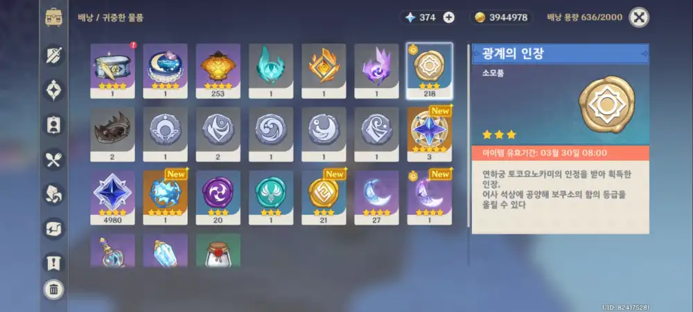 이벤트에서 받을 수 있는 광계의 인장, 보물상자에서 얻을 수 있는 광계의 인장, 퀘스트를 통해 받을 수 있는 광계의 인장만을 세면 170개가 나오는 듯합니다