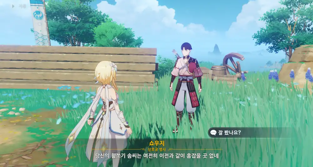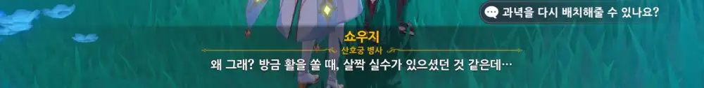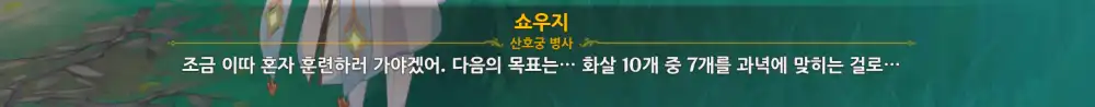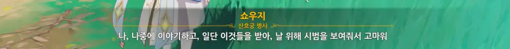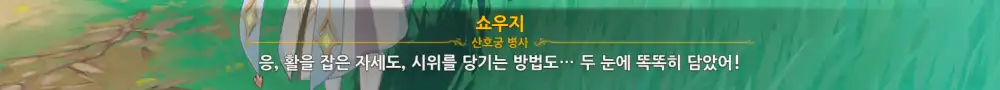 다 끝나면 페이몬이 활에 일가견 있다고 칭찬해주고, 쇼우지는 박수쳐준다.
