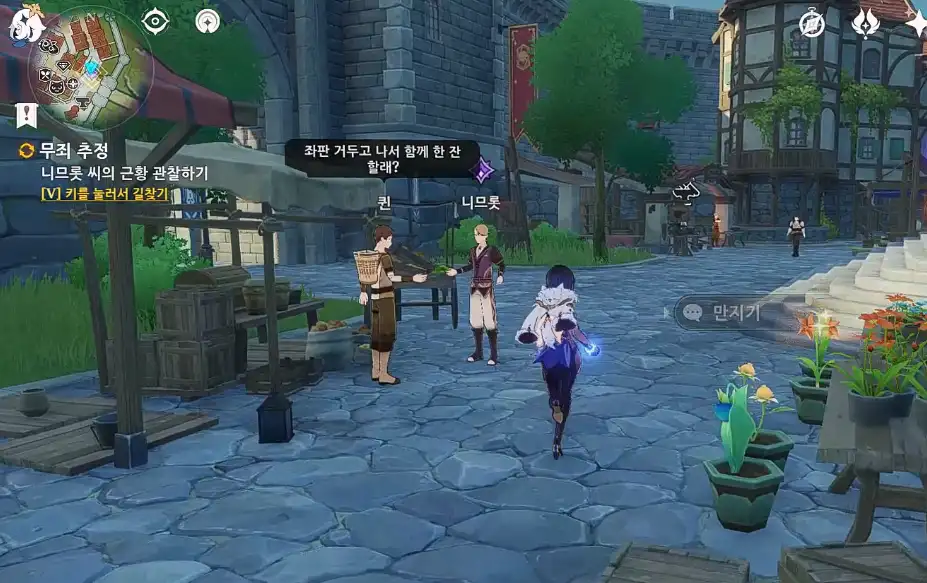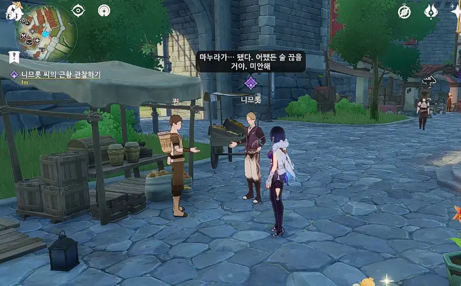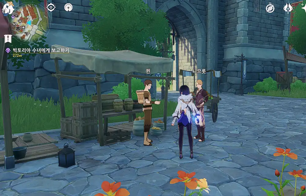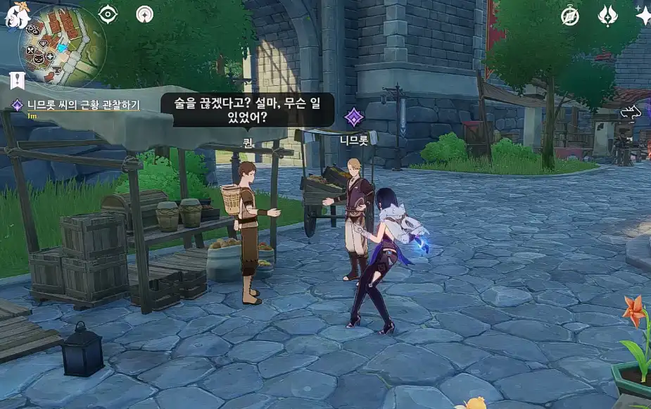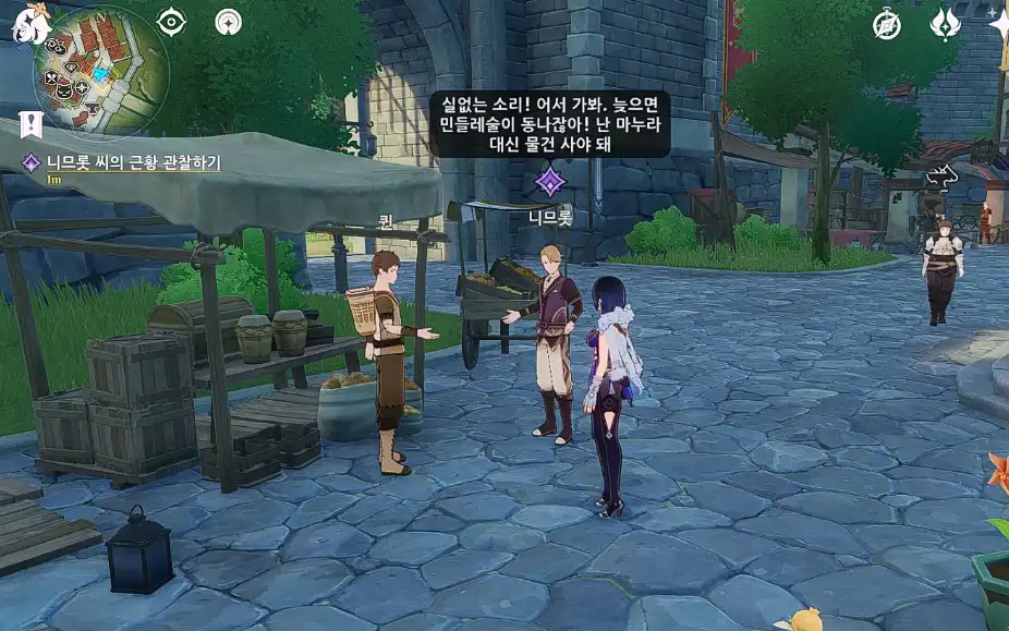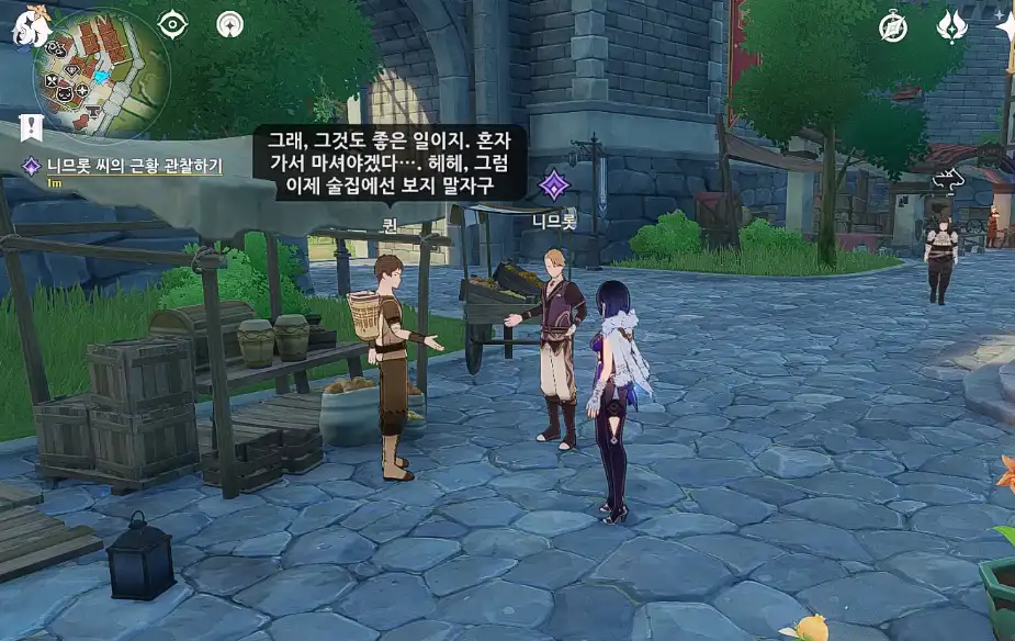 해당 위치로 다가가면 자동으로 과일 가게 주인 '퀸'과 '니므롯'이 서로 대화하는 모습을 보여준다.