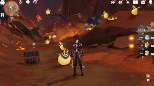 앞에 반짝이는 경고판 읽고나면 페이몬이 말거는데 그쪽으로 가면 카메라가 있음. 그 후에 화산폭발이 일어나는데 펭귄들 여러마리 날아오면 상자가 드롭되면서 업적따짐 |