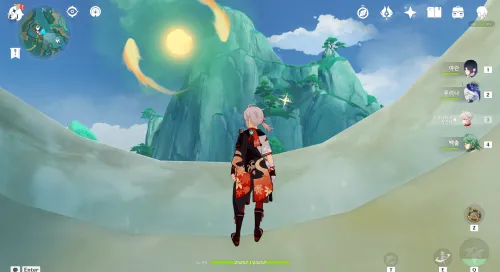 유적복구안하고 등반해서 올라왔으면 살짝 밑에보면 안으로 공간있는 곳에 황금잉어로 이동할수있는 포털있음, 조사포인트도있는데 조사하면 반대쪽 결계위치 반짝거리면서 줌되는 컷신나옴 |