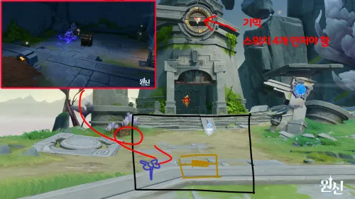 명룡으로 기둥 세우기 > 벽화에 명룡 E꾹 사용하고 적 3명 처치 > 염색 매니투로 기둥 염색 (초록색 = 노랑+파랑) > 아래로 내려가면 상자 |