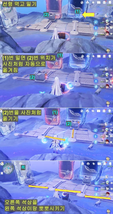 맨 오른쪽 블럭이 당겼다 밀어냈다 하는데, 블럭 중앙으로 당길때 오른쪽 블럭도 당기기 총 세번 > 석상끼리 뽀뽀 |