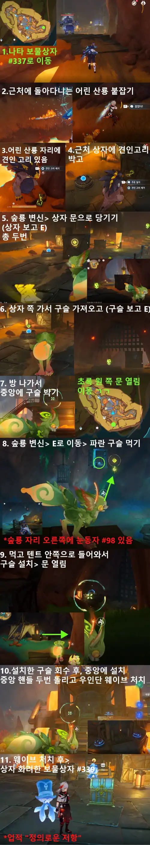 상자번호 바뀜. [#위치태그] 상자먹고 옆에 땅파는 산룡 잡으면 고리 뜸. 그거 먹고 철창 쪽으로 상자 땡긴뒤에 구슬먹고 하나 채워주면 나머지 한쪽있는 길이 열림. |