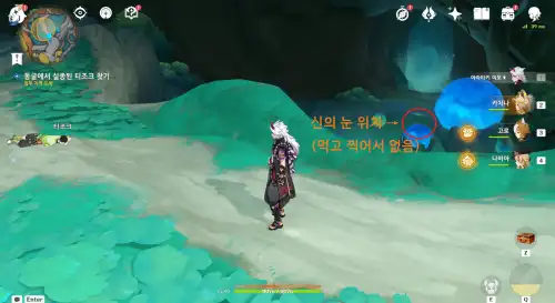 동굴 통행증 사용처는 불의 신의 눈동자[#위치태그] 근처로 가시면 됩니다. 느낌표 떠서 쉽게 찾아가실 수 있어요. (지도 기준 고대 전망대 비경 위쪽에 있어요.) |