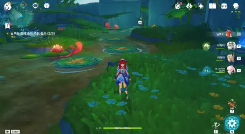 개구리 점프 해서 목적지 까지 가는데 중간에 도우미 개구리 이용해서 연꽃끼리 붙였다 뗐다 해서 지나가면 깨지는 기믹 |