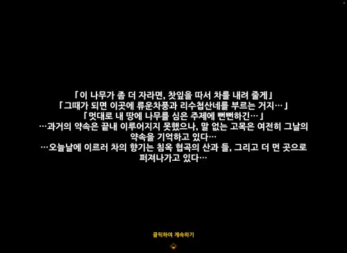 「이 나무가 좀 더 자라면, 찻잎을 따서 차를 내려 줄게」 「그때가 되면 이곳에 류운차풍과 리수첩산네를 부르는 거지...」 「멋대로 내 땅에 나무를 심은 주제에 뻔뻔하긴...」 ···과거의 약속은 끝내 이루어지지 못했으나, 말 없는 고목은 여전히 그날의 약속을 기억하고 있다... ...오늘날에 이르러 차의 향기는 침옥 협곡의 산과 들, 그리고 더 먼 곳으로 퍼져나가고 있다... |