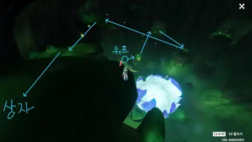 빛나는 문자 4개 순서되로 반대편에 있는 문자 직접 가서 만지면 상자 나옴 |