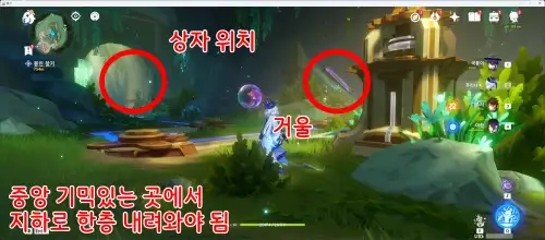 내부 수정 2개먹기 -> 장치에 두개 꽂고 상호작용 후 벽쪽 렌즈로 돌리기 -> 위에있는 폭약통 제거 |