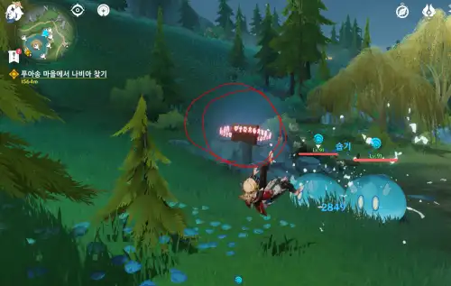 빛모양 마커가 있는데, 그곳에 서서 연못 방향에 있는 고리를 터트리면 됩니다 |