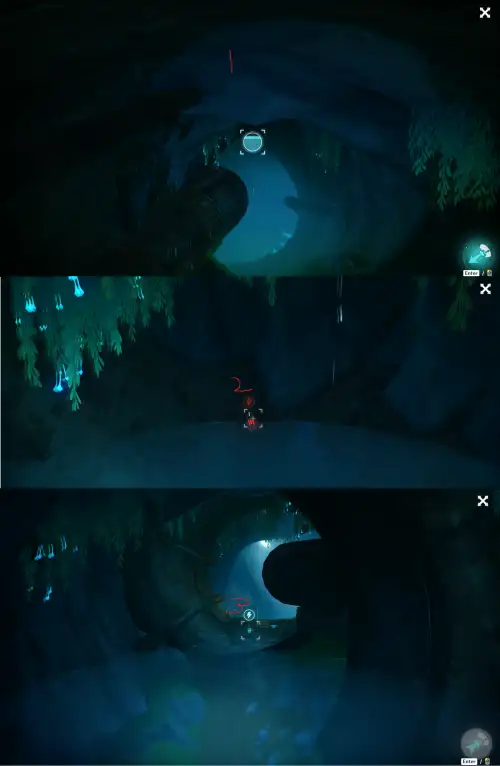 근처의 해파리 폭탄 먹은 다음에, 타격 시 불빛 변하는 랜턴(파랑/주황) 쳐서 첫번째 철창 열기 > 폭탄 차징으로 두번째 철창에 붙혀놓고 터뜨리면 꼴뵈기 싫은 꽃 둘 다 터짐 > 방 안에서 파랑/주황 랜턴쪽으로 해파리 폭탄 던져서 불 끄기 > 두번째 철창 열리면 들어가서 상자 먹기 |