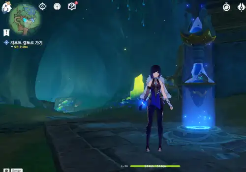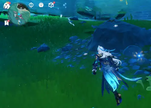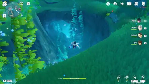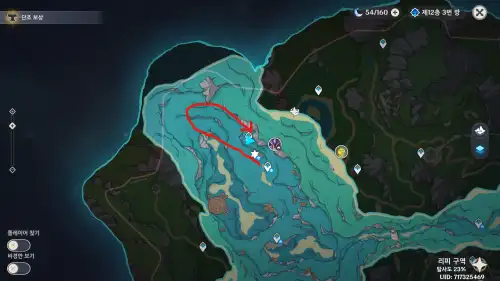 지도상 바로 아래 있는 54번 워프 타고 쭉 북쪽으로 해엄이다 보면 해저 동굴 있음 (입구에 물의 신의 눈동자 102번 있으니 참고). 들어가자마자 이동 기믹 타면 도착. 중간에 먹을거 아무것도 없음. 도착지점에 폰타인 상자 355번도 바로 옆에 있음. |