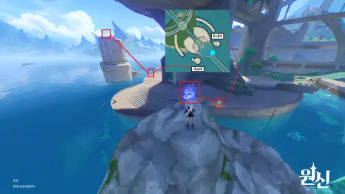 검은색 동그라미 친곳 워프타고 1번 검은색 짧은 경로로 가면 엘레베이터 나오는데 타고 폰타인성으로 가기 선택하고 멈추면 나온다음 2번 빨간색 경로로 쭉 가면 상자 나옴 나는 이게 제일 나았음. |