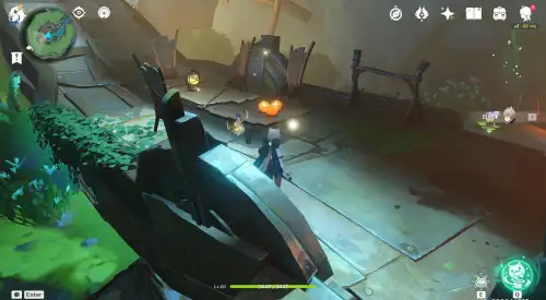 상자 기준 12시 3시 5시 7시에 횃불에 불 붙이기..부서진 작은 기둥위에 있는 삼각형 먹고 아래 발판 같은 거 위에 올려 놓으면 부품 생성..부품 만지기해서 머리 위에 노란 마름모 띄운 상태로 안 보이는 횃불 근처로 가서 불 원소로 횃불 때리기(베넷 추천) |